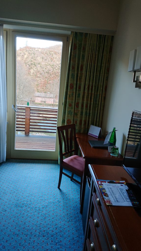 12:45 dann mit dem Gratis-Shuttlebus zum Kurhotel. Hab einiges an Gepäck bei mir. Auch, weil es hieß es werden Schneeschuhwanderungen angeboten…