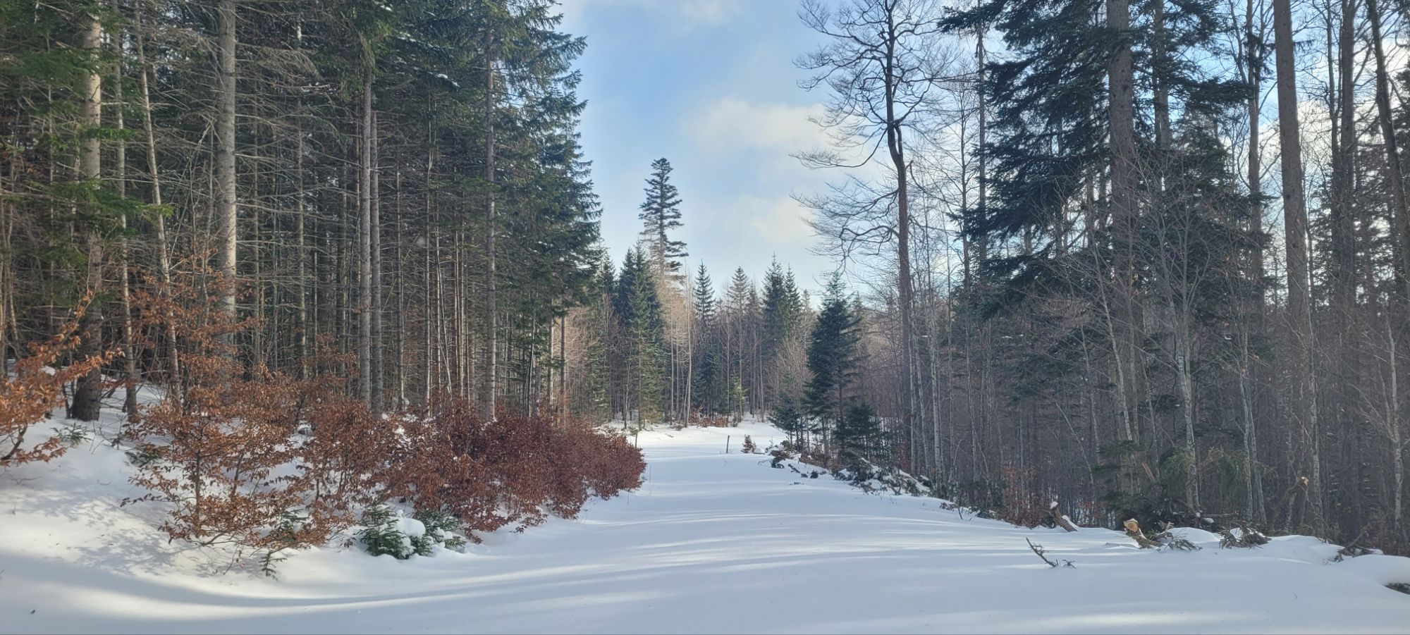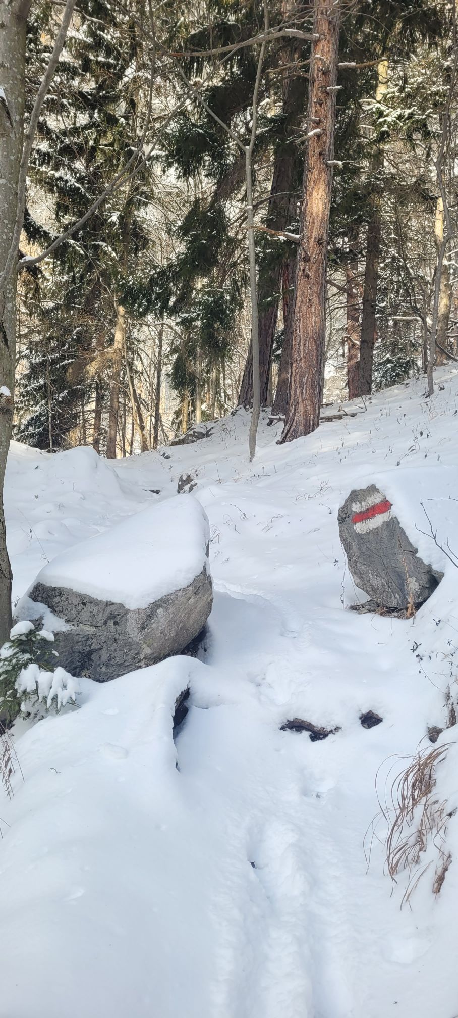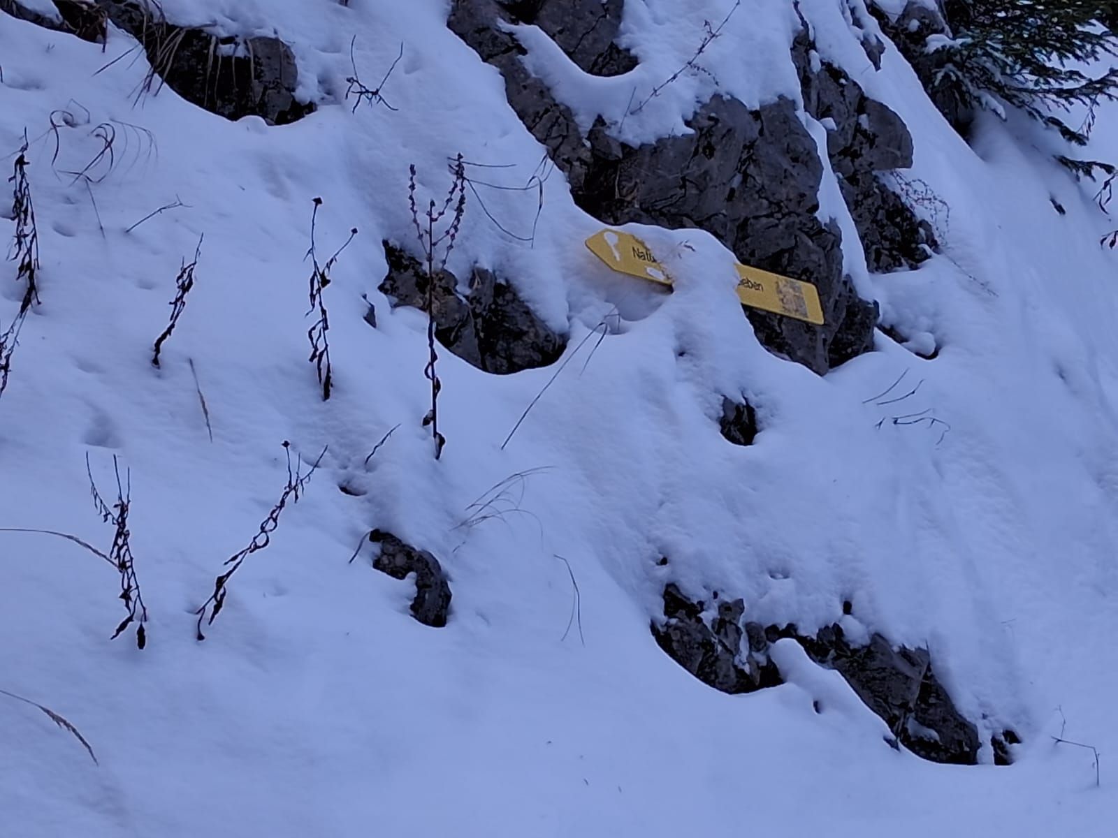 Gingen ein Stück, den obigen Weg – im Neuschnee, zwar leicht bergab. Trotzdem hätte ich kein soo gutess Gefühl – den geplanten Weg zu gehen…